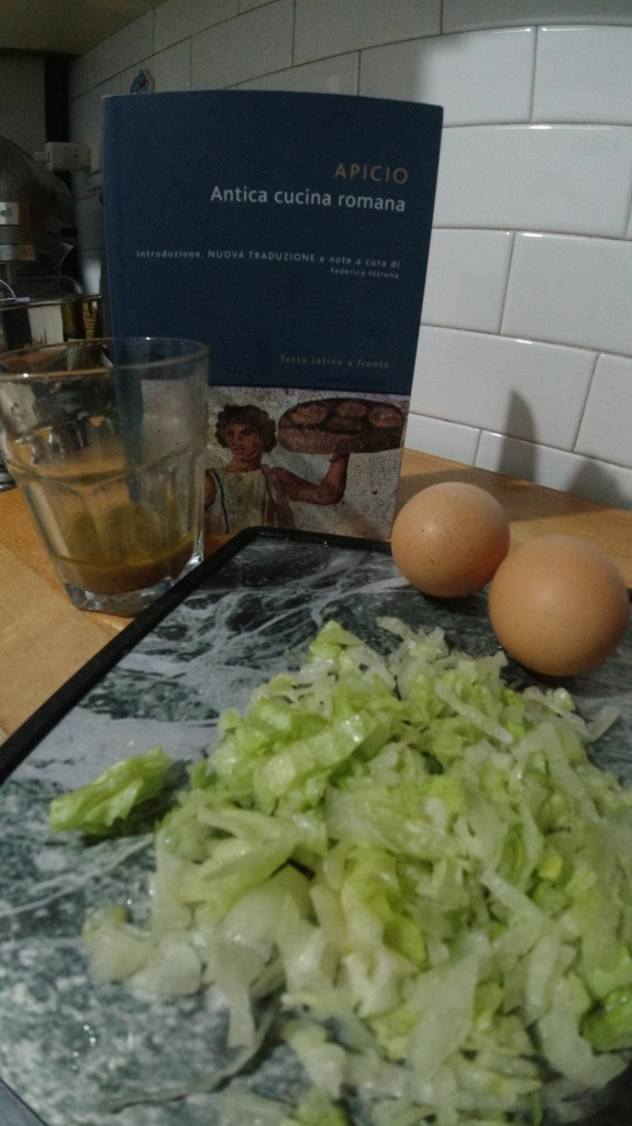 Tritare la lattuga finemente e metterla da parte. Preparare i condimenti unendo in un bicchiere la salsa di garum, un filo di vino cotto, un filo di olio evo, pepe q.b. e mettere da parte.