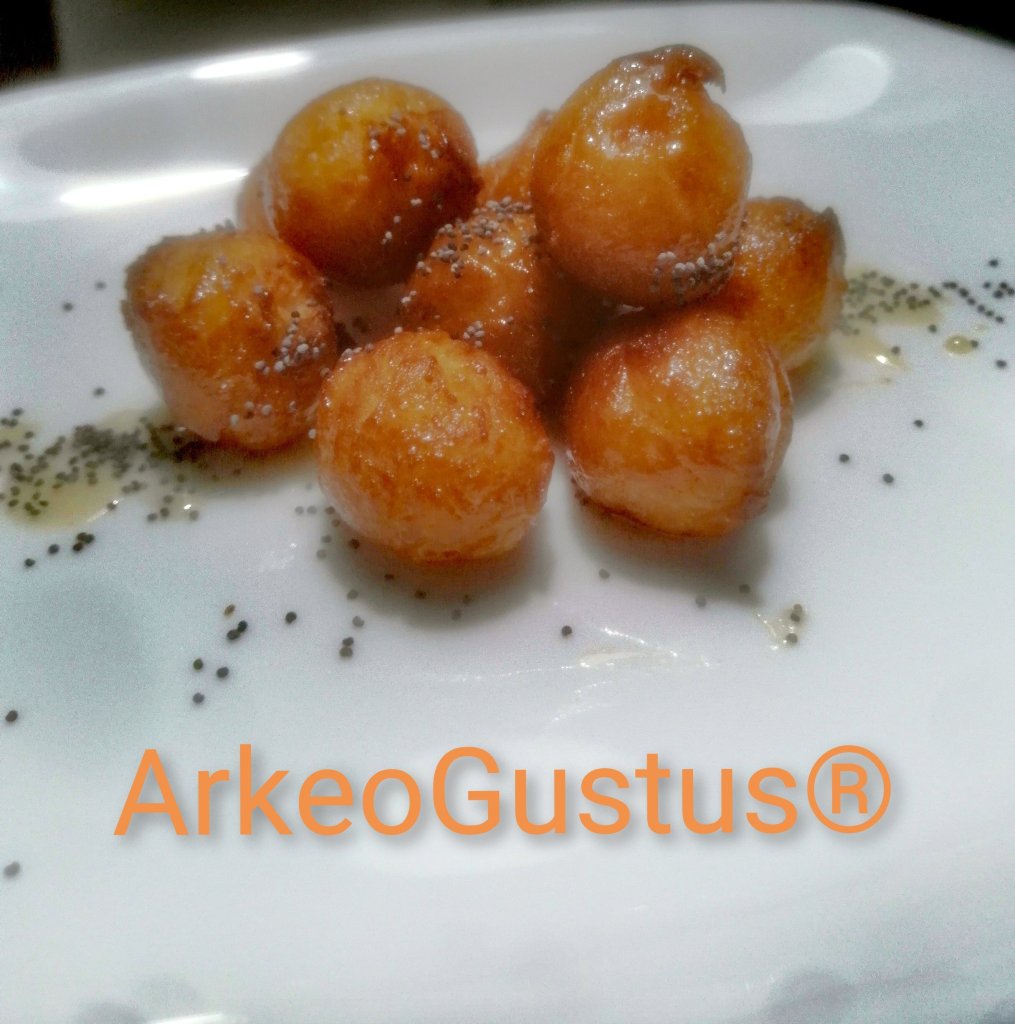 Fai così i globi: Mescola del formaggio fresco con alica. Tu deciderai quante ne vorrai fare. Metti strutto caldissimo in una padella di bronzo. Friggi i globi uno o due alla volta e, aiutandoti con due bastoncini, falli girare spesso su di loro. Quando sono cotti tirali fuori, bagnali nel miele e poi spolverizzali con semi di papavero e così li servirai.