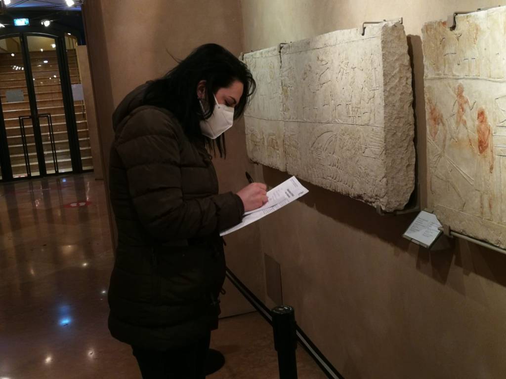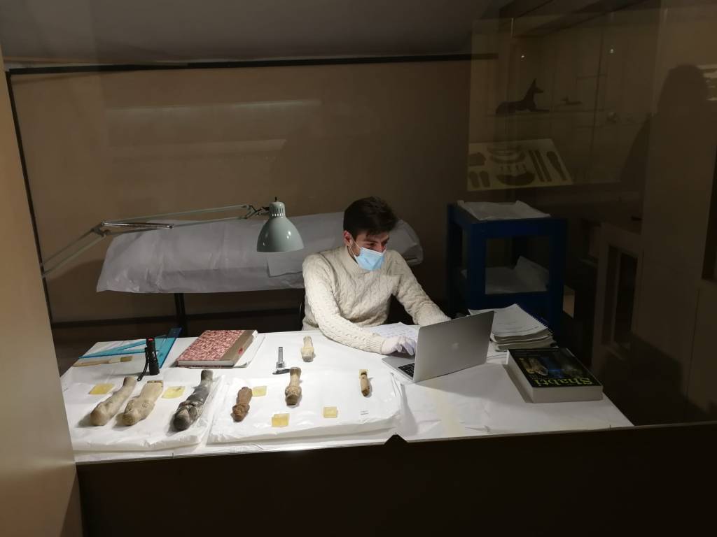 Attraverso questo percorso così coinvolgente ci chiediamo, come la civiltà etrusca possa incontrarsi con quella dell’antico Egitto. Abbiamo provato a cercare la risposta visitando gli spazi dedicati alla collezione egizia del Museo Civico Archeologico. Nella sezione dedicata ai papiri, abbiamo conosciuto un dottorando in Egittologia dell’università di Pisa, Alessandro Galli, che si accingeva a esaminare degli Ushabti, ovvero piccole statue, elemento integrante del corredo funerario. Non volendolo disturbare oltre, abbiamo proseguito con la nostra visita ma ci è piaciuta la possibilità data al visitatore di potersi soffermare dinanzi ad uno studioso, in una sorta di interazione, seppur divisa da un vetro, non convenzionale.