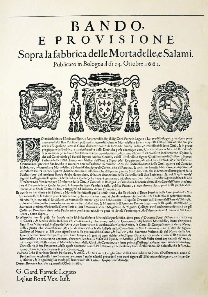 Nel 1661 il Cardinale Farnese, emise un bando per la codifica produttiva della Mortadella fornendo uno dei primi esempi conosciuti di disciplinare simile agli odierni D.O.C. e I.G.P, che rendeva la produzione di questa leccornia competenza della corporazione dei Salaroli, i quali avevano come simbolo il mortaio e il pestello (un rimando all’antichità?).