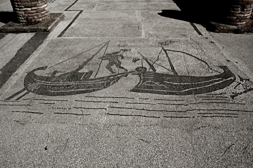 “Poiché il Tevere si allarga molto là dove si unisce al mare e forma grandi baie pari a quelle dei migliori porti marittimi; e, cosa più bella di tutte, la sua foce non è ostruita da banchi di sabbia accatastati dal mare, come accade in molti anche dei grandi fiumi, né vagando di qua e di là per paludi e paludi si spende davanti al suo ruscello si unisce al mare, ma è navigabile ovunque e si scarica per la sua unica vera foce, respingendo l’onda che viene dalla principale, nonostante la frequenza e la violenza del ponente su quella costa…