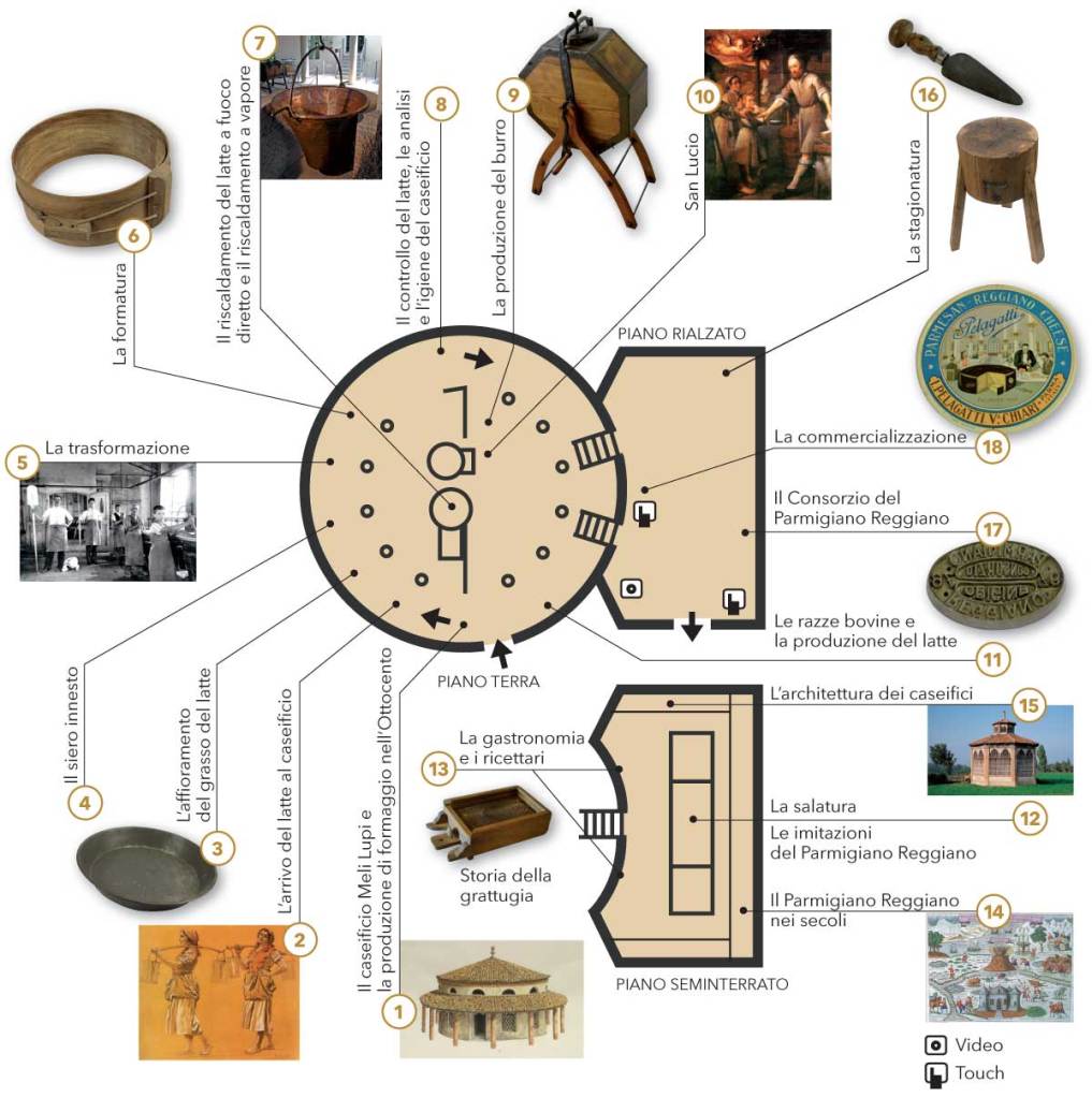 Lo spazio circolare accoglie al centro l’antica caldaia in rame per la preparazione del formaggio, circondata dai vari attrezzi e strumenti. Vi è anche spazio per la produzione del burro e per la figura di San Lucio di Cavargna, protettore dei casari. Nel locale sotterraneo della salamoia è narrata la storia del formaggio Parmigiano, dal XII secolo ad oggi, la sua filiera produttiva e la storia della grattugia. È anche visibile un’esposizione dedicata alle numerose imitazioni del Parmigiano Reggiano esistenti all’estero. Negli ambienti rustici annessi al corpo principale del museo è esposta, inoltre, una rassegna di attrezzi e oggetti quotidiani della civiltà contadina legati ai temi dell’alimentazione.
